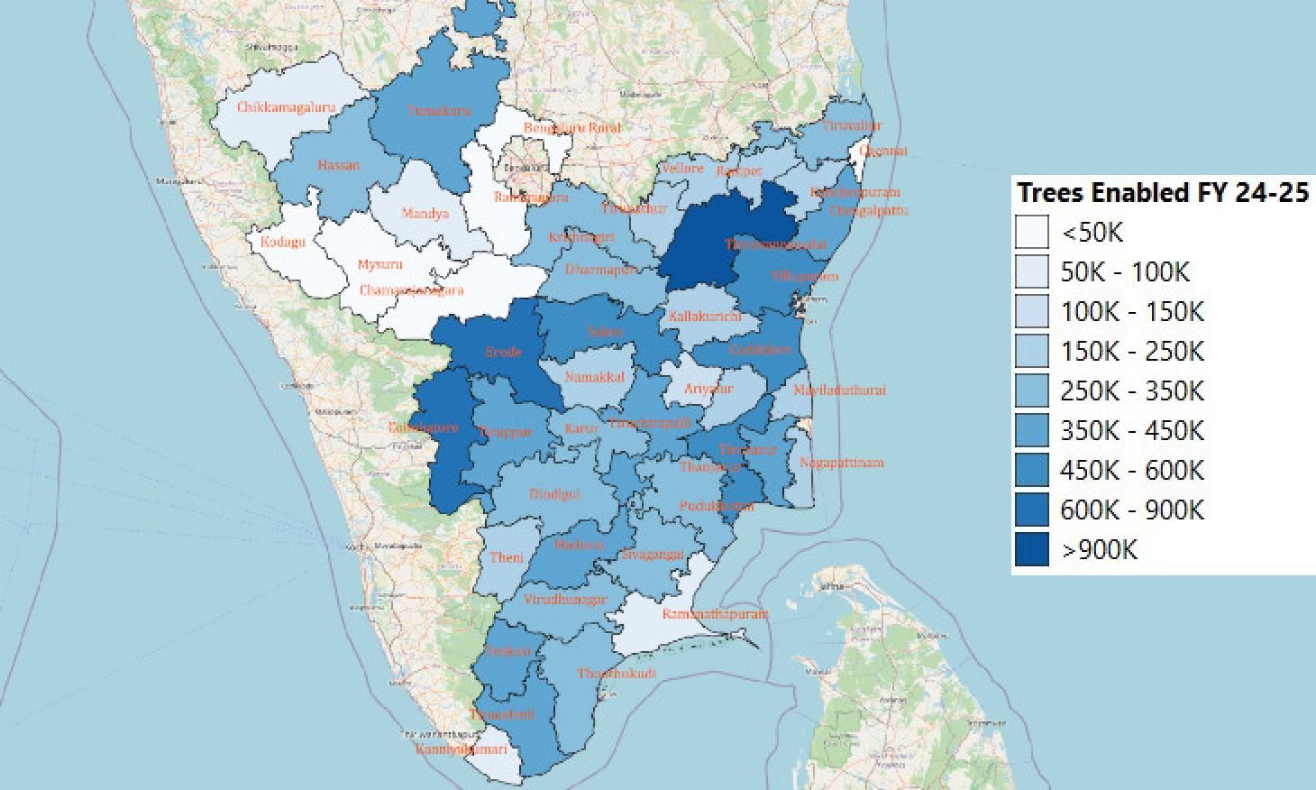 The Cauvery Calling Farmer Outreach program provides many essential services to farmers transitioning to tree-based agriculture. The program offers access to high quality educational resources, subsidized organic saplings, and free on-site services.