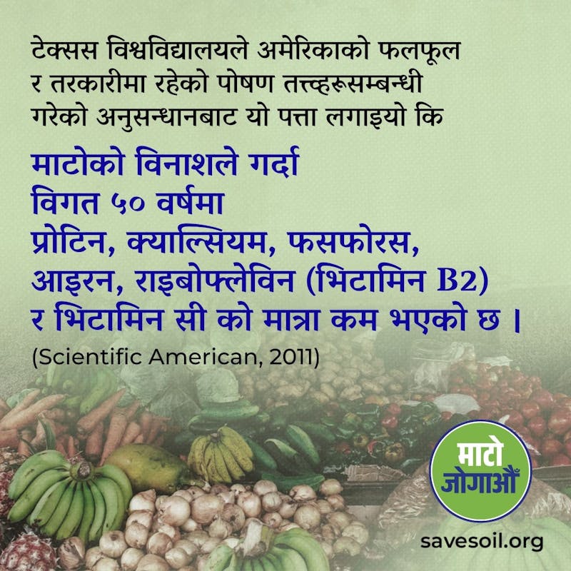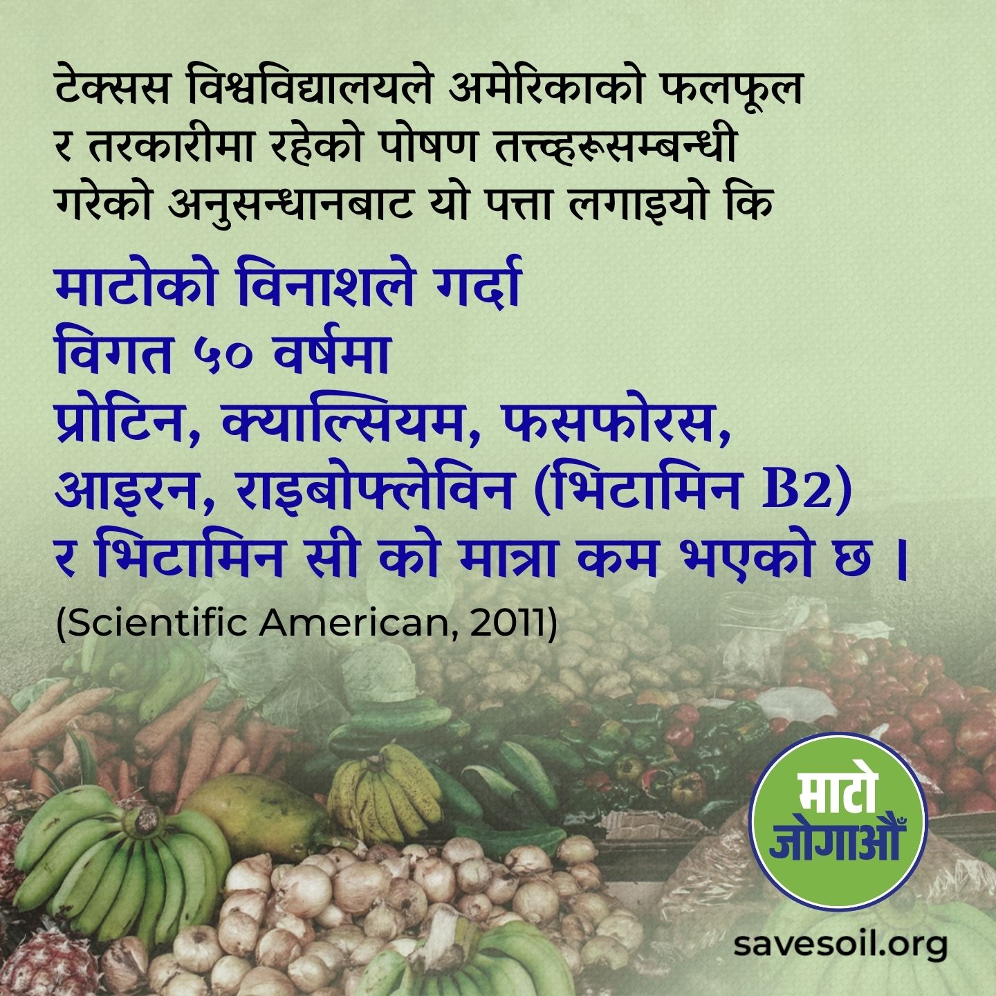 टेक्सस विश्वविद्यालयले अमेरिकाको फलफूल र तरकारीमा रहेको पोषणे तत्त्व्हरूसम्बन्धी गरेको अनुसन्धानबाट यो पत्ता लगाइयो कि माटोको विनाशले गर्दा विगत ५० वर्षमा प्रोटिन, क्याल्सियम, फसफोरस, आइरन, राइबोफ्लेविन (भिटामिन B2) र भिटामिन सी को मात्रा कम भएको छ । (Scientific American, 2011) #SaveSoil savesoil.org